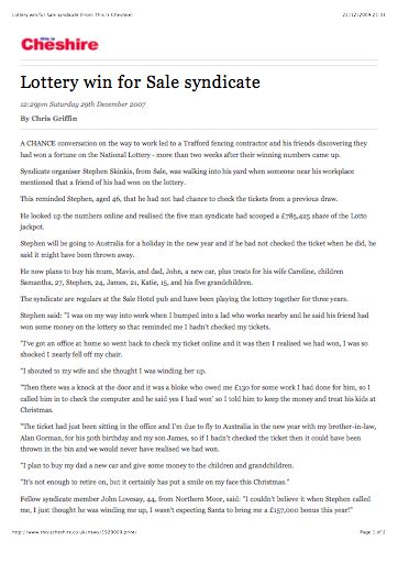 Lottery win for Sale syndicate (From This Is Cheshire) - Source Lottery win for Sale syndicate